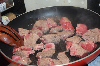 Chop your meat, and heat the oil in a pan. Sear the meat, I